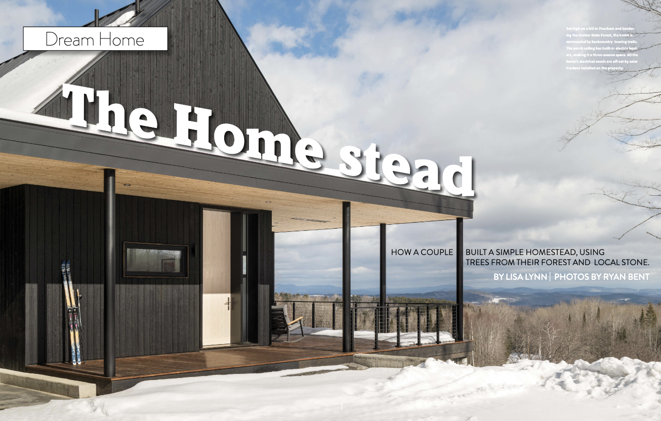 Winter Holidays Issue, 2024 “The Dream Home” is set in the Northeast Kingdom and affectionately called the Gable and Plane house by renowned architect Elizabeth Hermann for its simple lines. “The gable of the main structure is enhanced by the vertical siding and the straight long plane of the porch roof, which provides a geometric contrast.” The home comfortably draws from its surroundings by including the use of local stone and trees from the property were transformed into the flooring to ground the home into the vast landscape within which it rests.