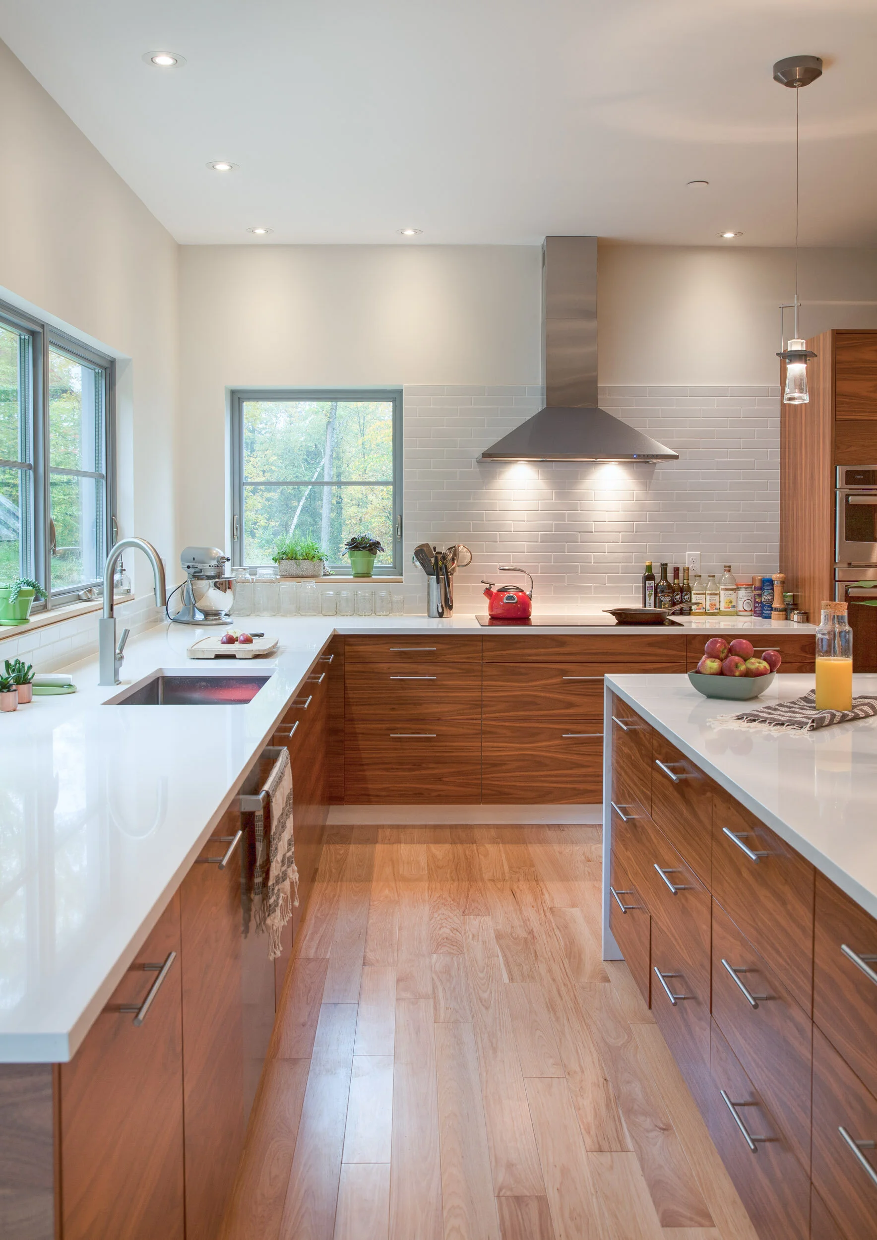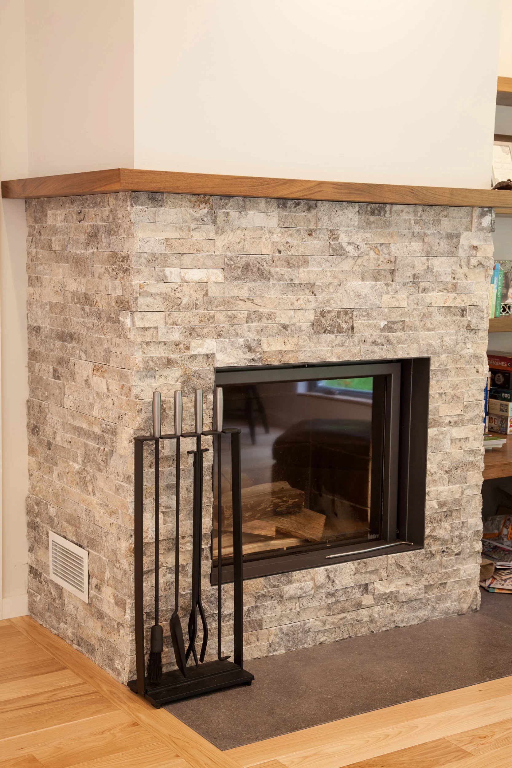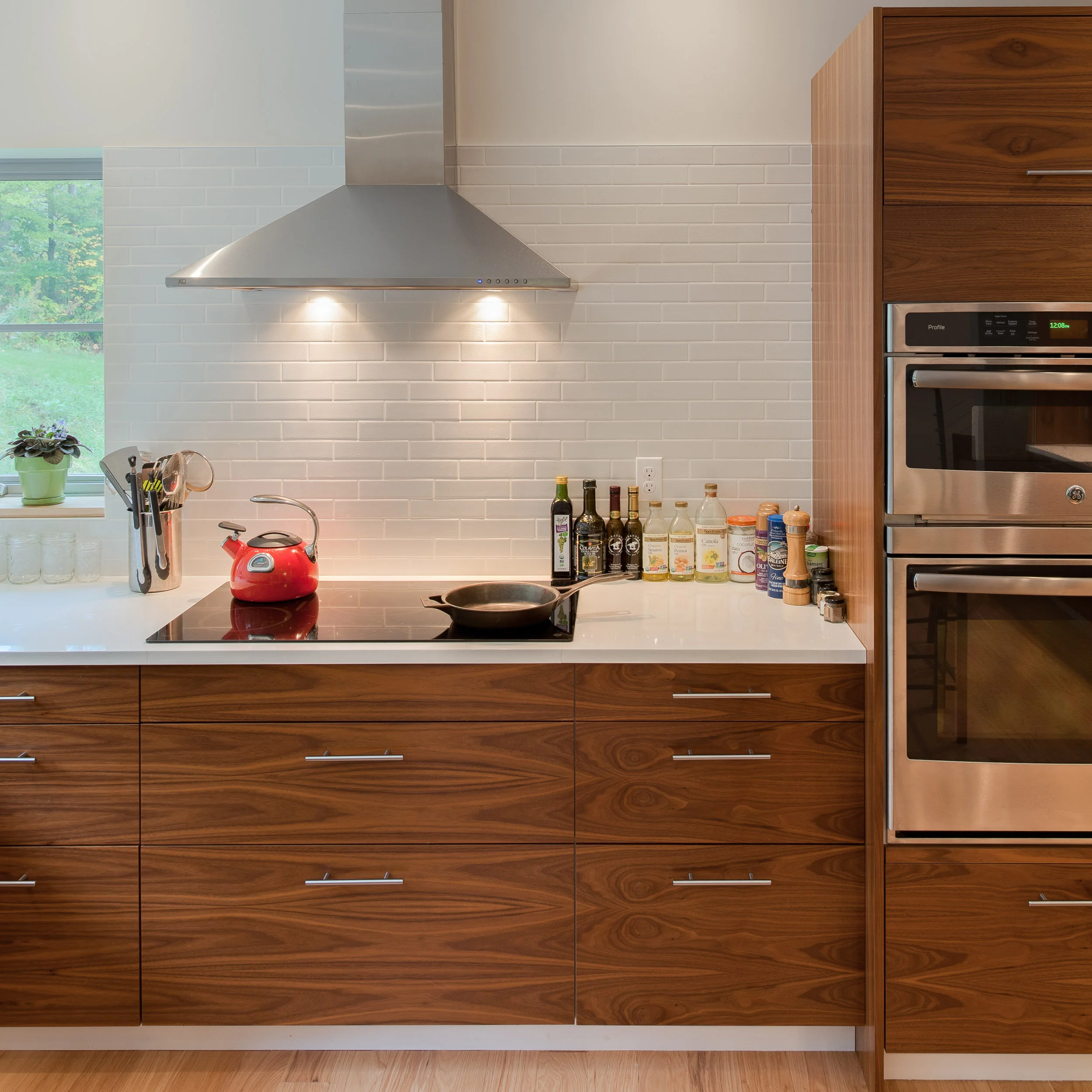 This is 2,800 sq. ft. high-performing house is designed for future attached garage and office. We call this a Near-Zero home because of the overall energy efficiency. A supplemental high-efficiency Stuv wood-burning stove provides a substantial amount of the total heating requirements. Design features include super-insulated building envelope, triple-glazed windows and doors, and geothermal heating and cooling. The future addition of roof-top solar on house and garage will yield the house a Net-Zero home in overall energy requirements. The traditional vernacular form is punctuated by many modern design elements, including custom stairs and steel railings, custom walnut veneer cabinetry, modern timber-frame entry, polished concrete, and stunning tile work.