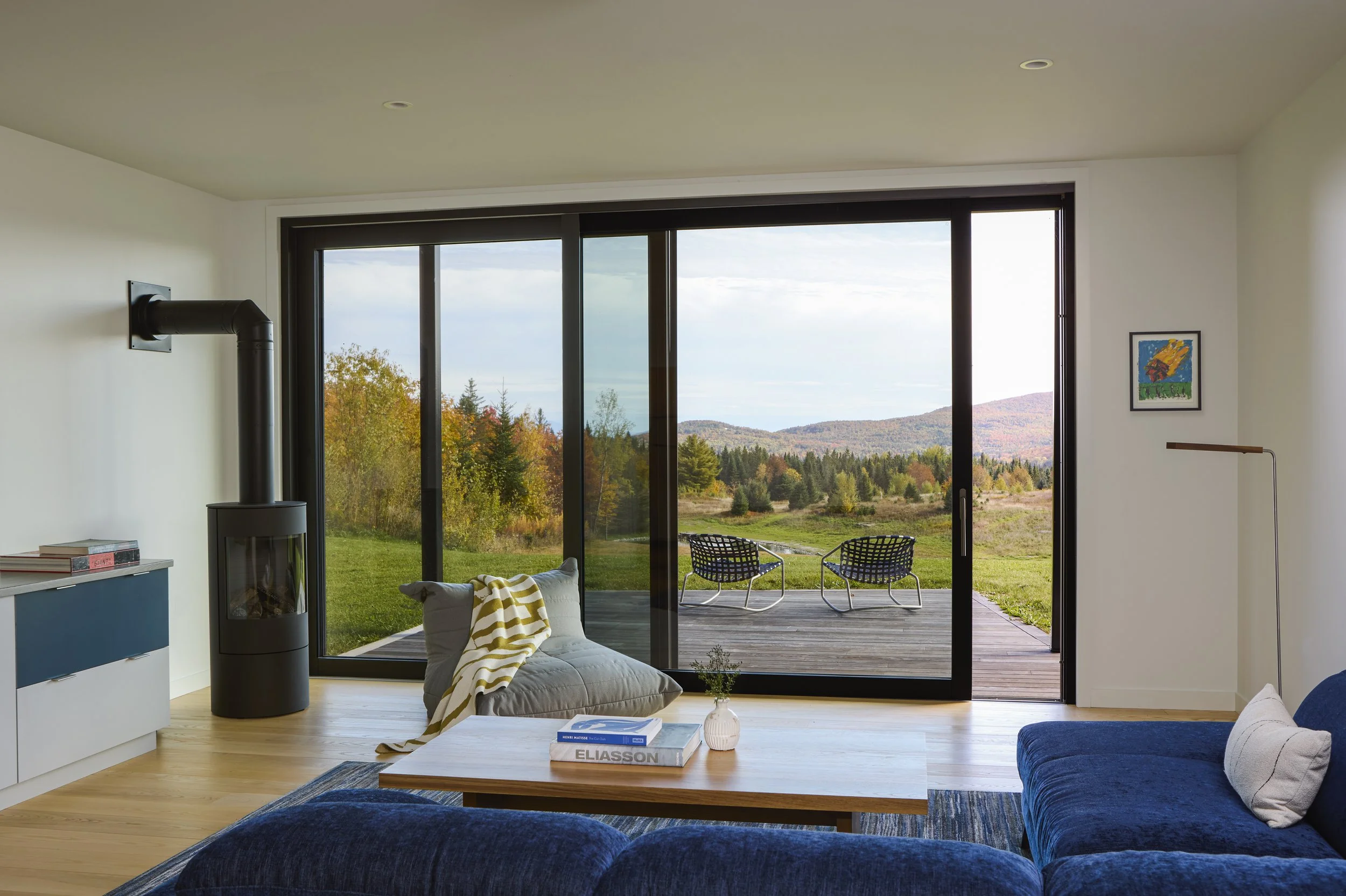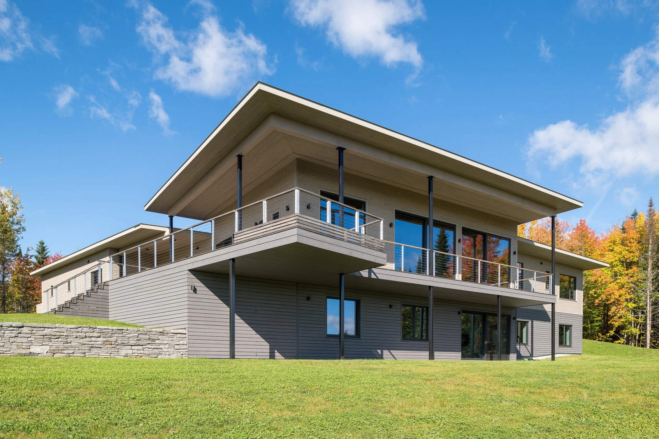 Set on a knoll, at 1,800 ft. elevation, in the town of Walden, this contemporary post and beam captures the pastoral views of the Northeast Kingdom. Large European triple glaze windows and lift-slide doors provide uncompromising performance without sacrificing views. With a high-efficiency heat-pump HVAC system and a field-mounted array of solar panels, the house minimizes its footprint. Designed by architect Ernie Ruskey, of Tektonika, to take advantage of the southern views, the house features large south-facing decks on both levels. There is a music room separated by shoji screen doors that slide away and transform the great room into a performance space. The wood ceilings enhance the acoustical comfort of the great room space and provide visual warmth.
