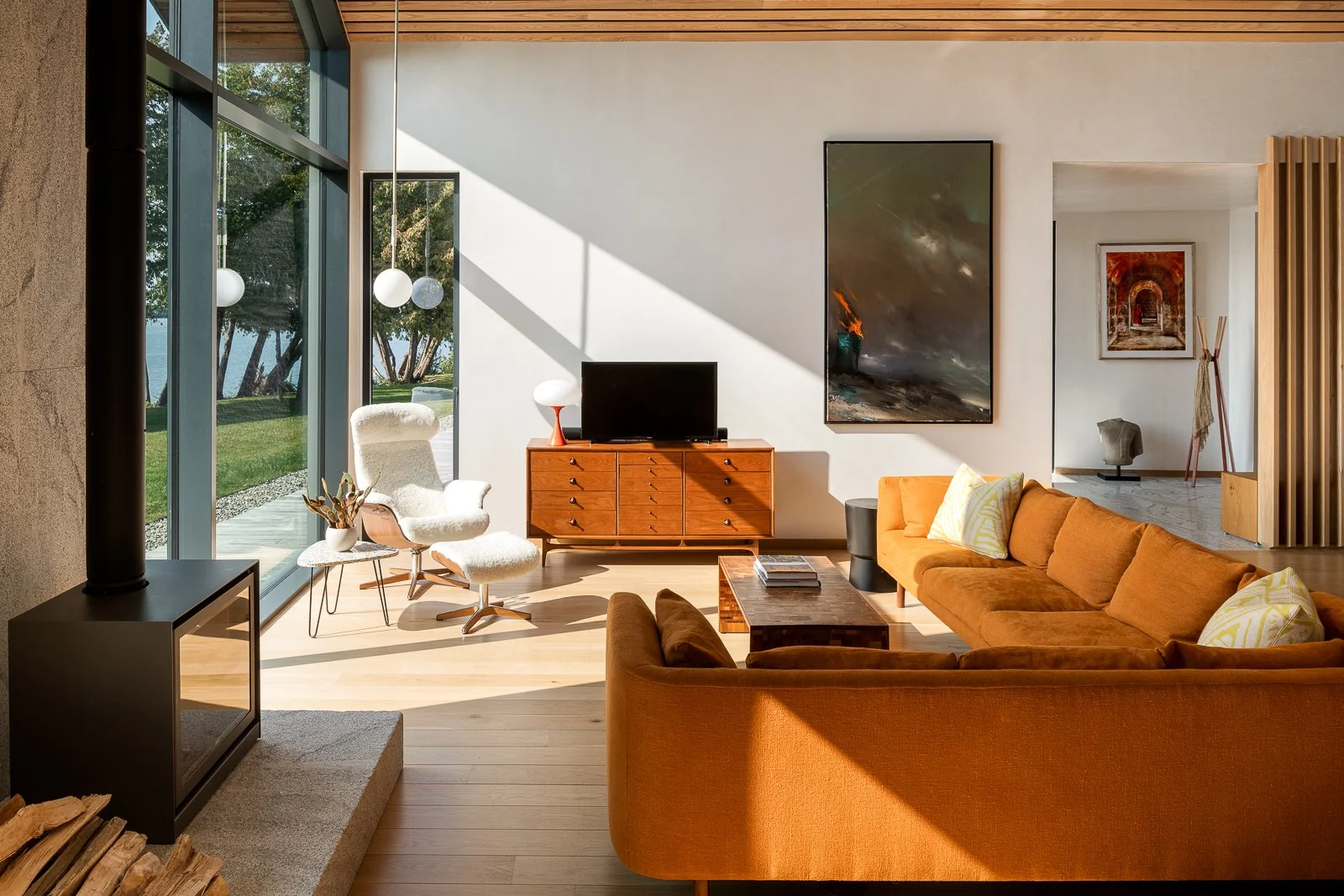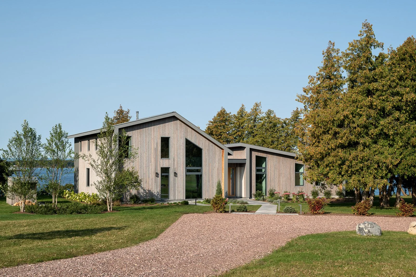 Set on the shore of Lake Champlain, VT, amidst apple and cedar trees and overlooking the Adirondack, is this high-efficiency modern house was designed by Montreal architect, Godefroy Meyer. The house was designed for an empty-nest couple from France to have a self-contained primary space joined by a central connector to a single-level guest area with an office and music room. The robust performance package includes triple-glaze windows and doors from Europe and a high-efficiency heating and cooling system. Stone veneer panels offer a striking contrast to the sugi-ban wood siding. The polygonal and vaulted great room space is defined by huge walls of glass, white oak floors and slat walls and an ash ceiling.