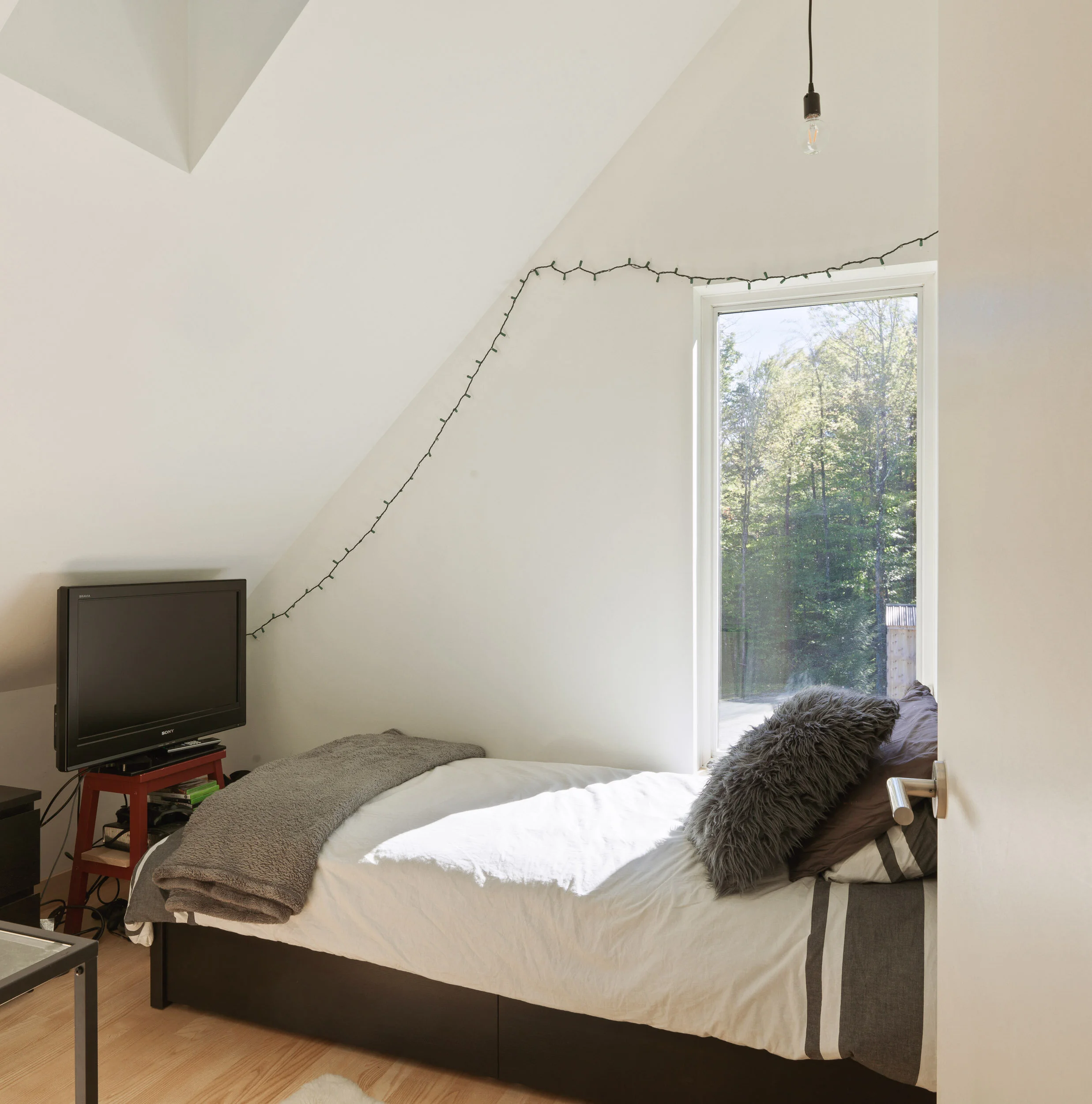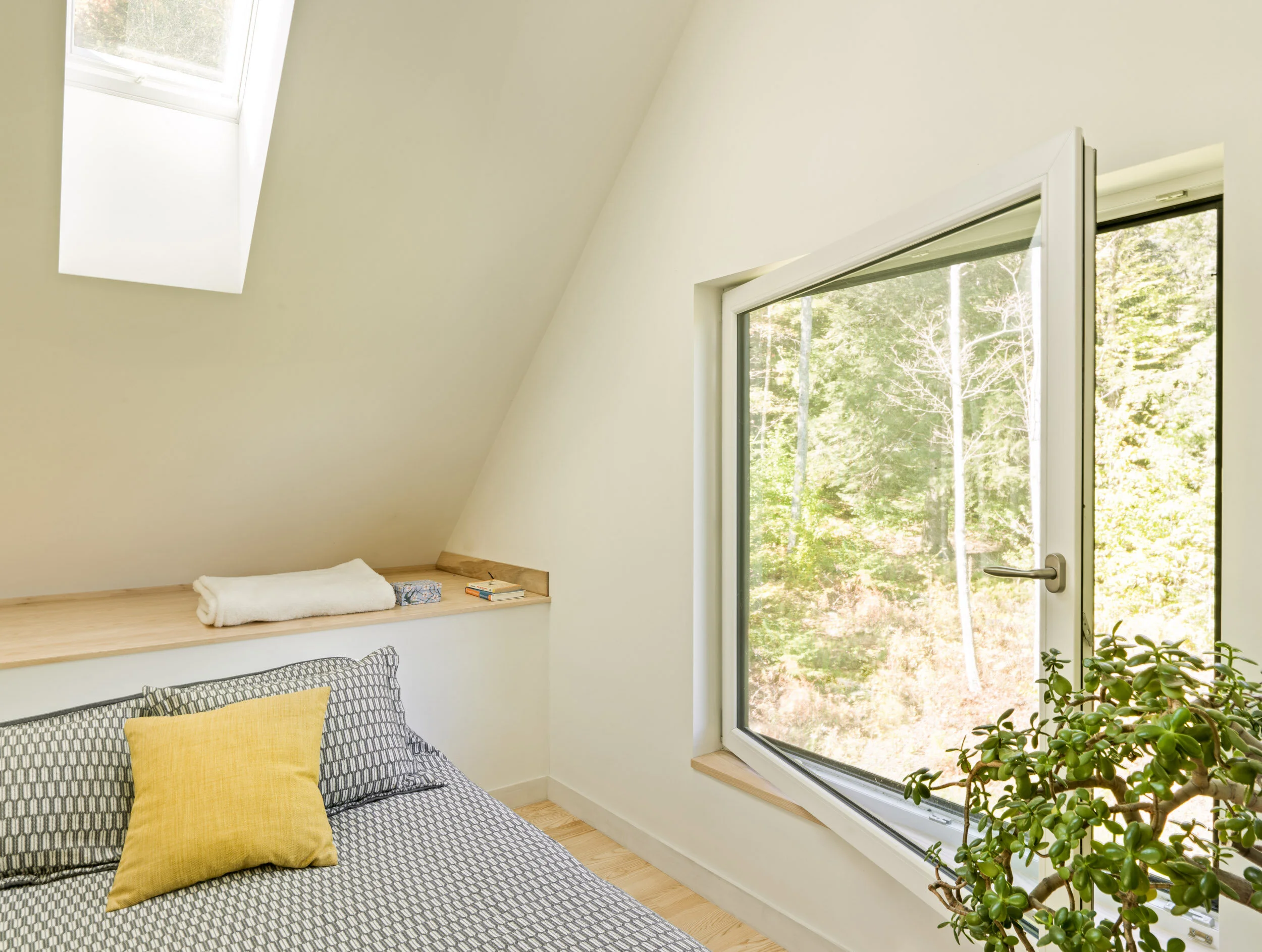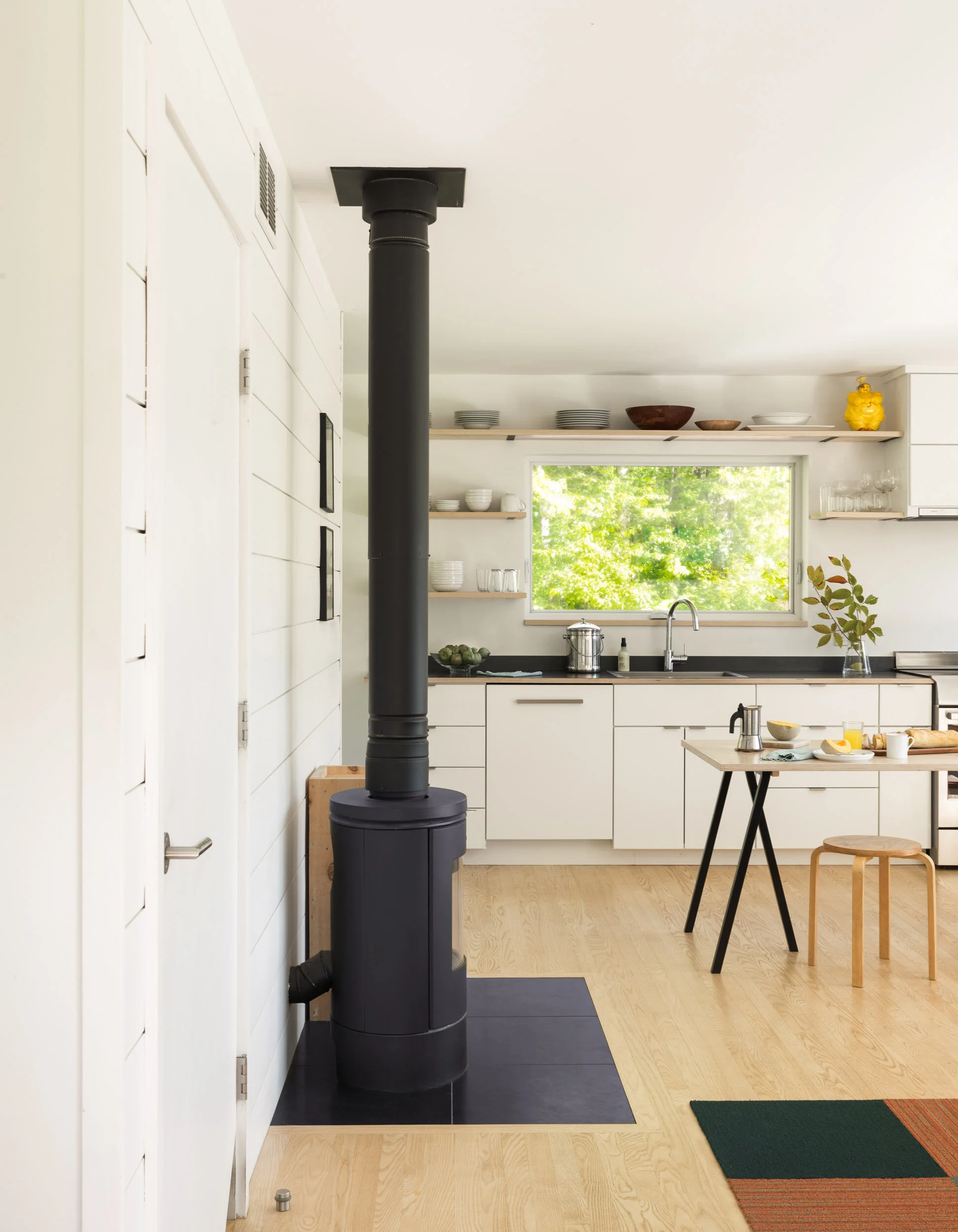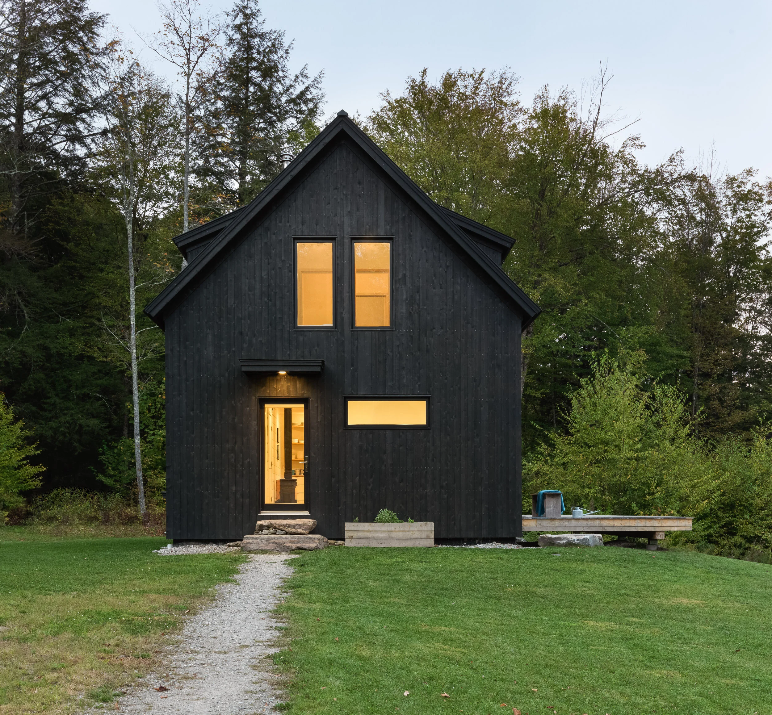 This 1,100 sq. ft. 3-bedroom cottage in the Mad River valley was designed by architect Elizabeth Herrmann for a family of four who dreamed of downsizing and reducing energy consumption. Situated on an east-facing slope with a view over the Mad River, the little black house features a standing seam roof, triple-glazed windows from Alpen and a high-performing insulation package. A small Morso wood stove provides heat in the winter. A single Mitsubishi heat pump provides cooling in the summer and backup heat in the winter. Water is heated by an electric heat pump water heater.
