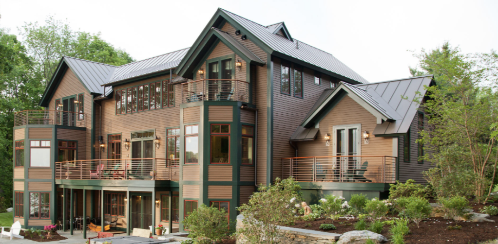 The house on Paradise Bay in the Champlain Islands was originally conceived as a renovation. The couple was winding down careers that had taken them across the country, and they were ready to return to Vermont. The 50 acres, with lake front and sweeping views to east across Lake Champlain, was just what they were looking for in a property. The existing house didn’t check all the boxes. The clients needed a place where their friends from across the country could come and visit and be comfortable for an extended stay. Working with Architect Theresa Findeisen the clients developed a plan to renovate. After several iterations and unsuccessful attempts to make all the pieces come together, they switched plans and decided to rebuild. Fiendissen developed a plan that maintained the lake-home charm of the original structure but added three distinct guest suites with balconies and views, a bar and game room along with a gallery space above the living room. There’s a chef’s grade kitchen and screened in porch for dining in the summer months. There’s a 3-bay garage with a gym above it. The interior was designed by Trice Stratmann; it has classic styling and is furnished for comfort. The many built-ins were provided by Birdseye Woodworking. Stark Mountain Woodworking provided the custom mahogany front door.