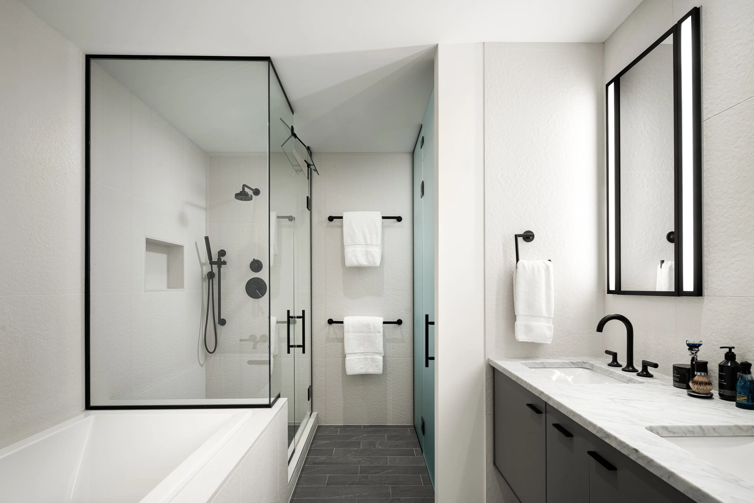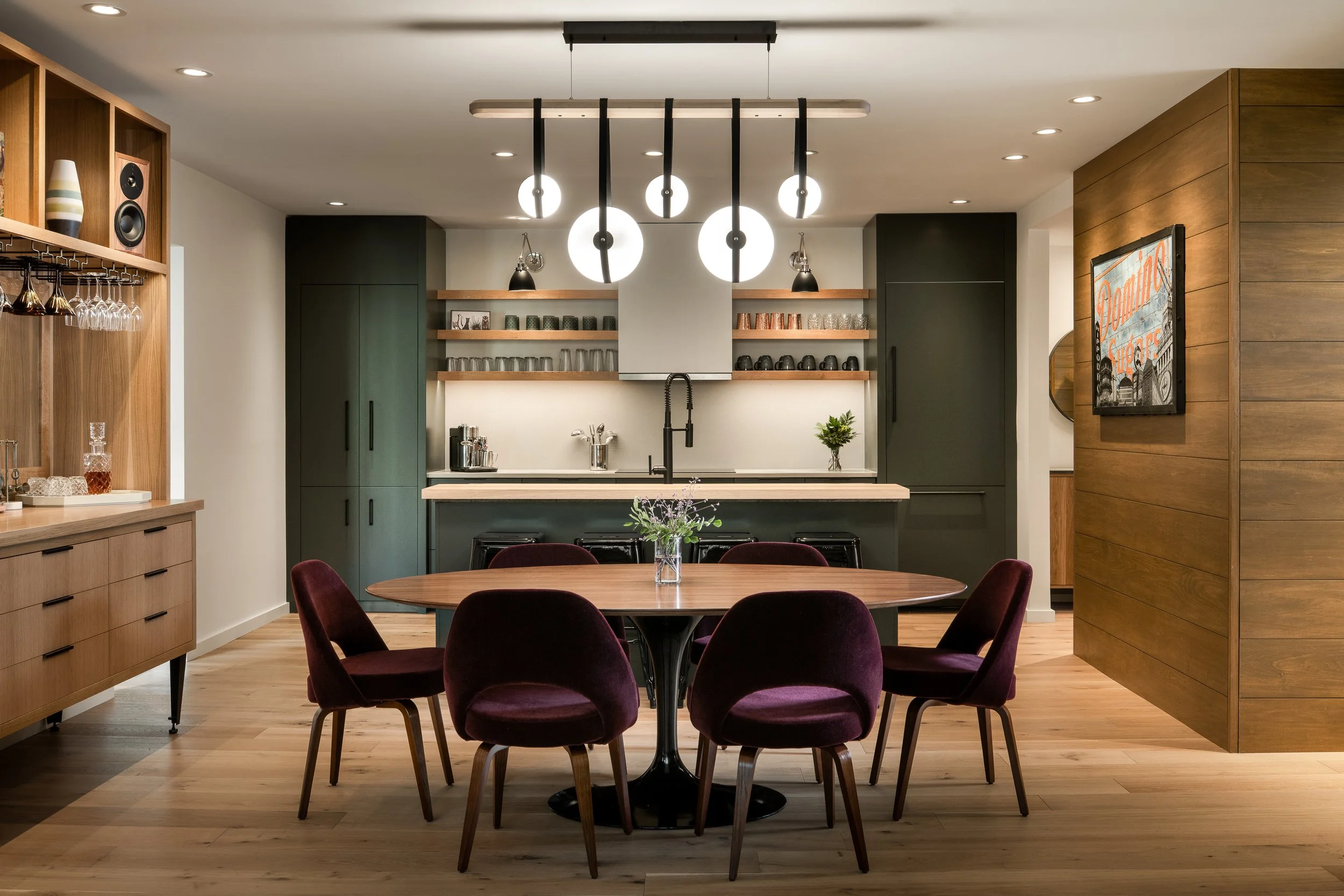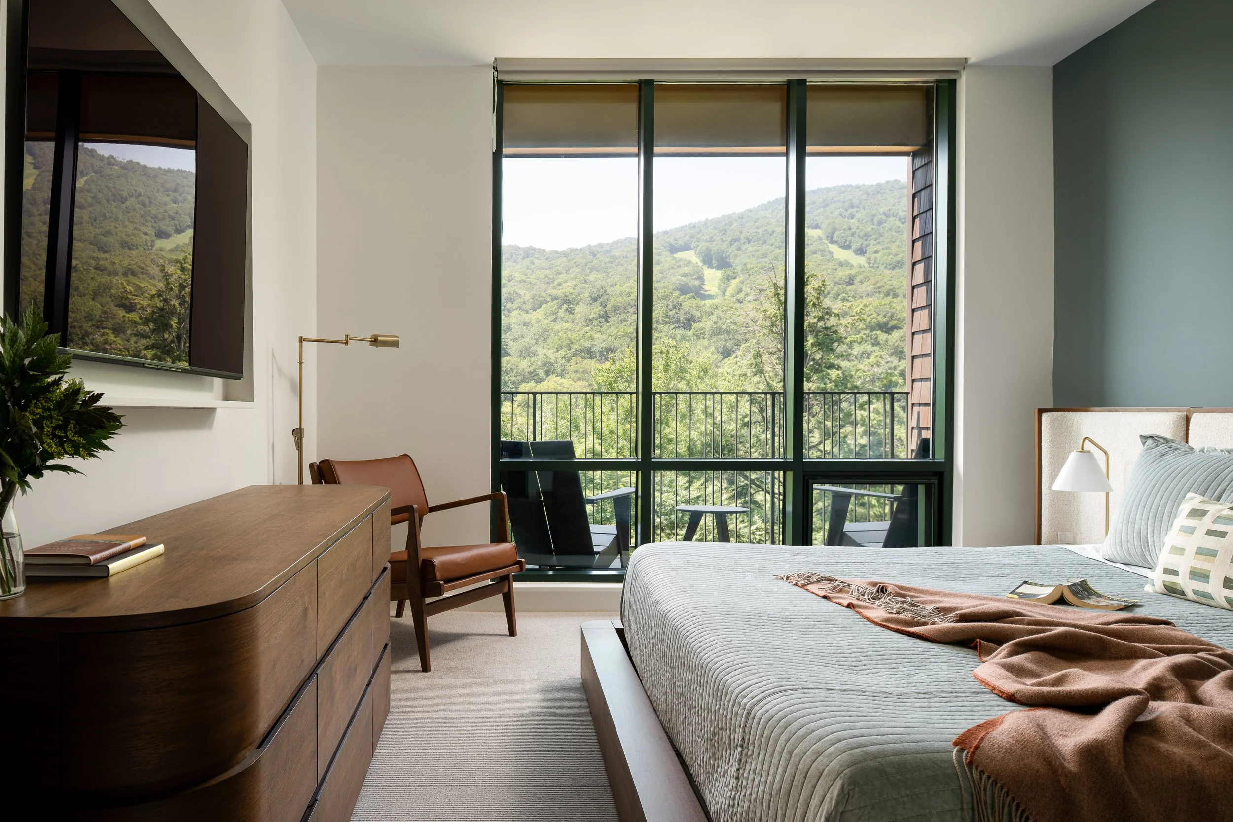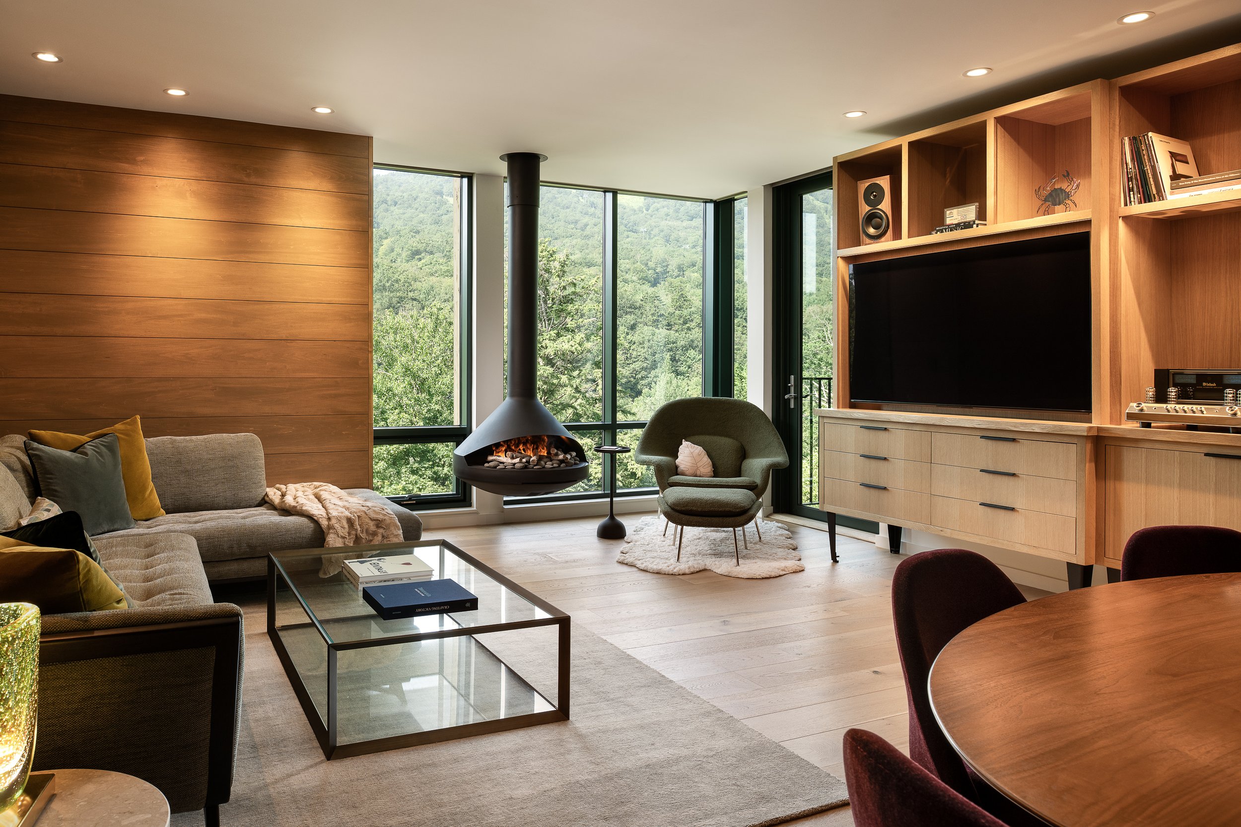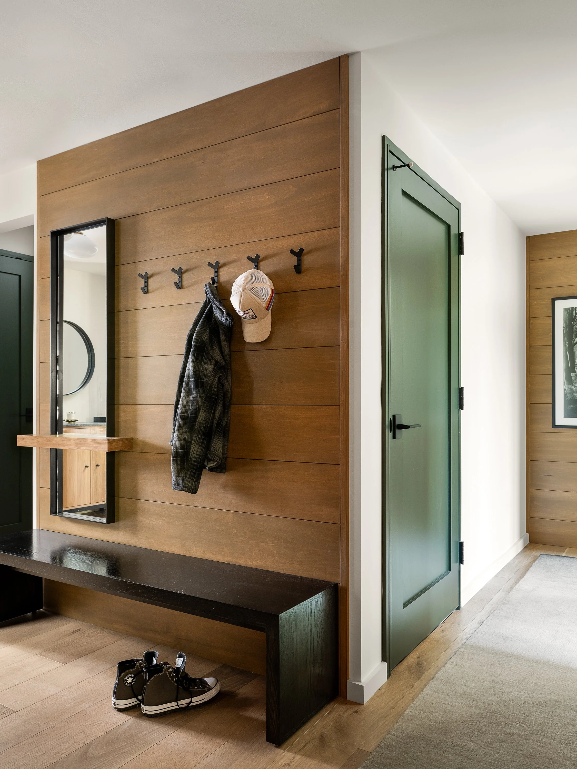 In this treehouse luxury interior revamp, warmth and texture were introduced using basswood wall paneling throughout the living room, entry, and hallway. The entryway received a quiet yet impactful update with a re-stained bench, integrated hooks, and updated lighting. We reworked the hall closet and added a pantry cabinet in the corridor to the guest bedroom. The bedrooms, previously carpeted, were upgraded with matching wood flooring for a seamless flow. The result is a space that feels grounded, custom, and unmistakably personal.